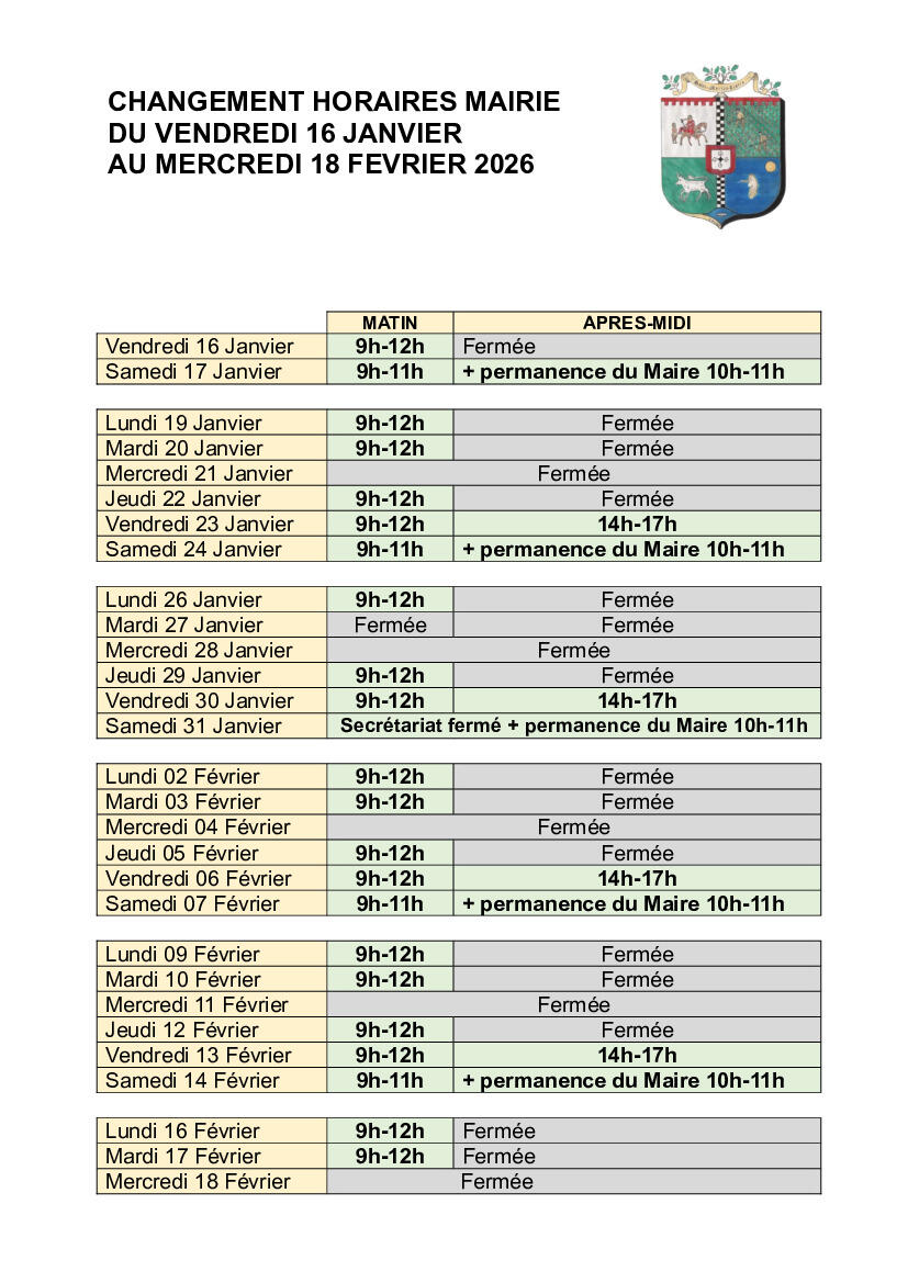 Horaires Mairie Vendredi 16 Janvier au Mercredi 18 Février