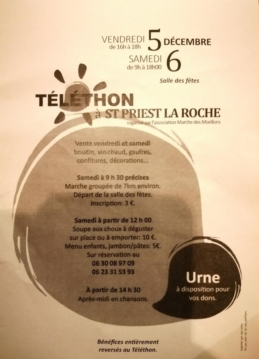 À partir du mercredi 12 novembre, les bénévoles de l'équipe du TÉLÉTHON de Saint-Priest-la-Roche se déplaceront de maison en maison pour vous proposer de réserver la soupe aux choux, boudins et/ou repas pour les enfants.
