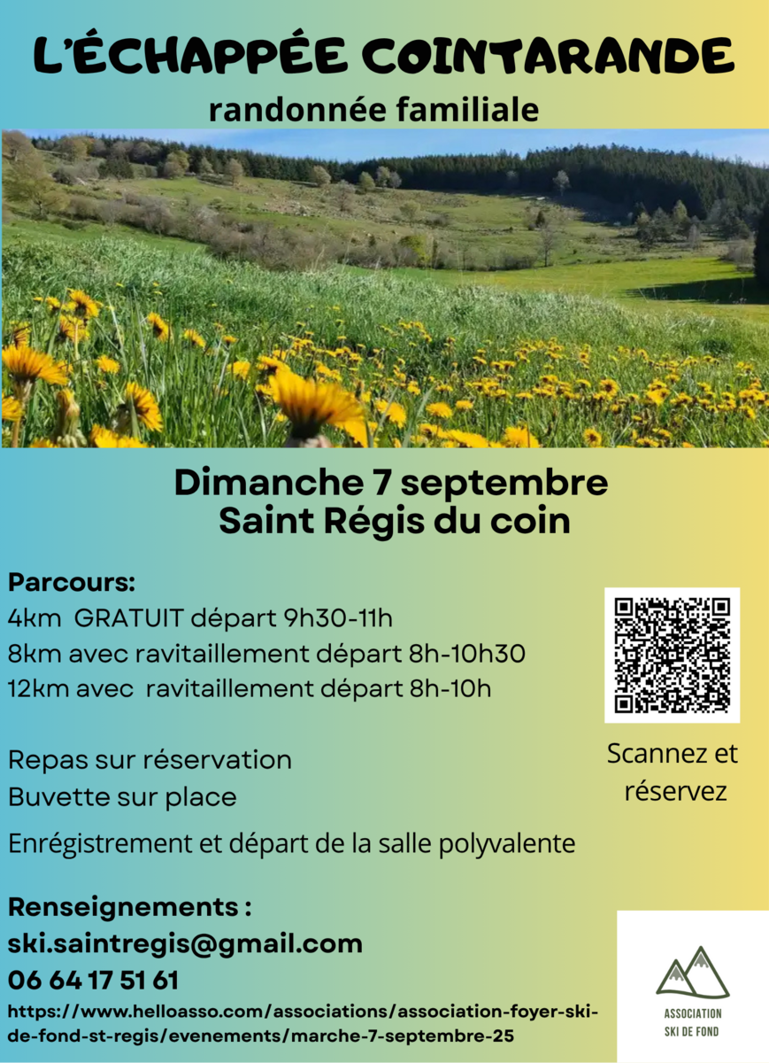 Randonnée familiale 8/11/25 NOUVEAU ! Marche familiale autour de St Régis du coin. Parcours adapté aux familles avec jeunes enfants. Repas et buvette. Réservations https://www.helloasso.com/associations/association-foyer-ski-de-fond-st-regis/evenements/marche-7-septembre-25