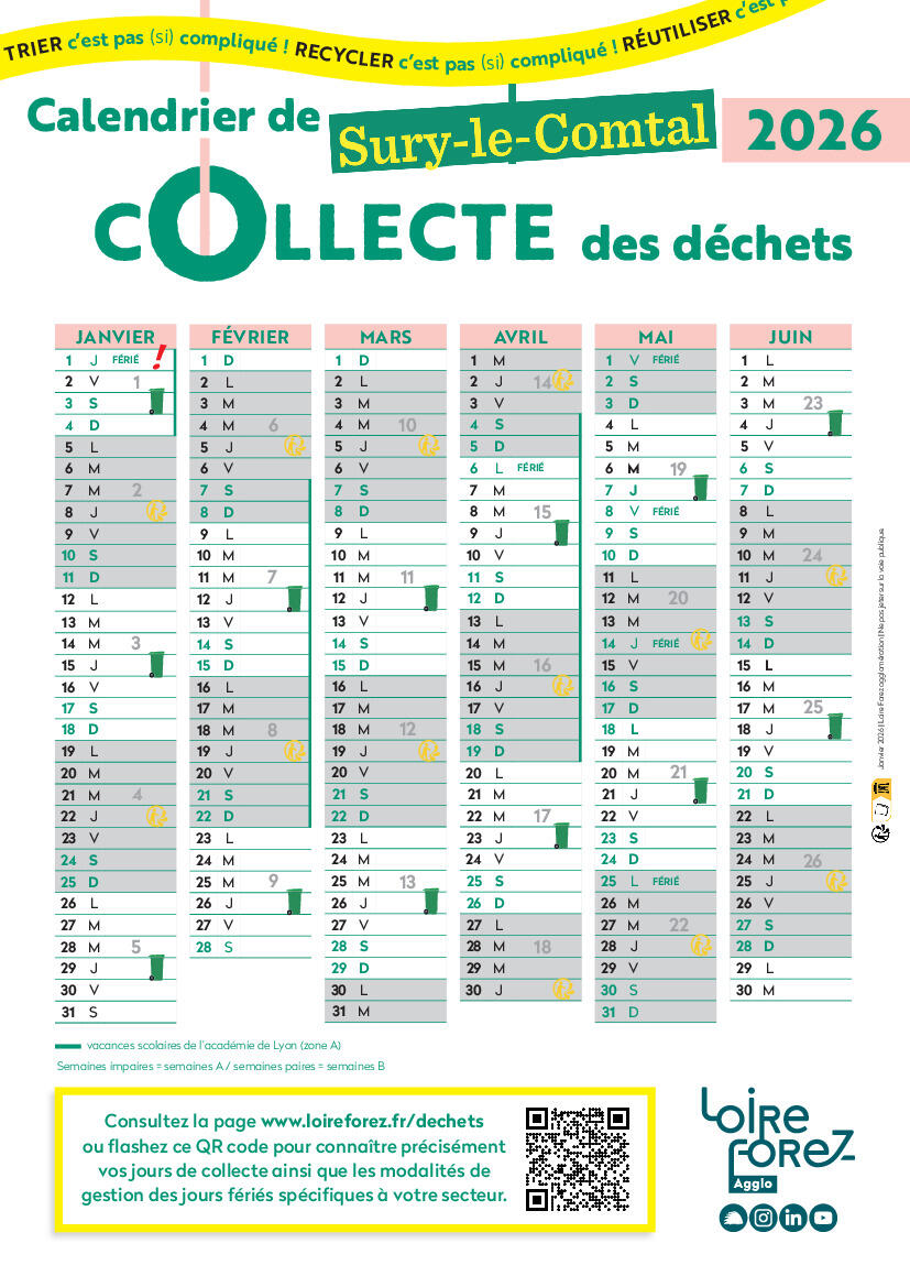 CALENDRIER 2026 de collecte des déchets pour Sury-le-Comtal