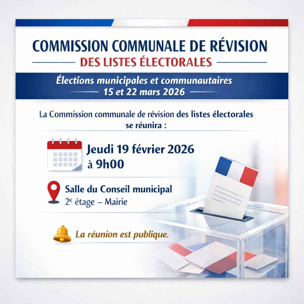 Dans le cadre des élections municipales et communautaires des 15 et 22 mars 2026, la Commission communale de révision des listes électorales se réunira :