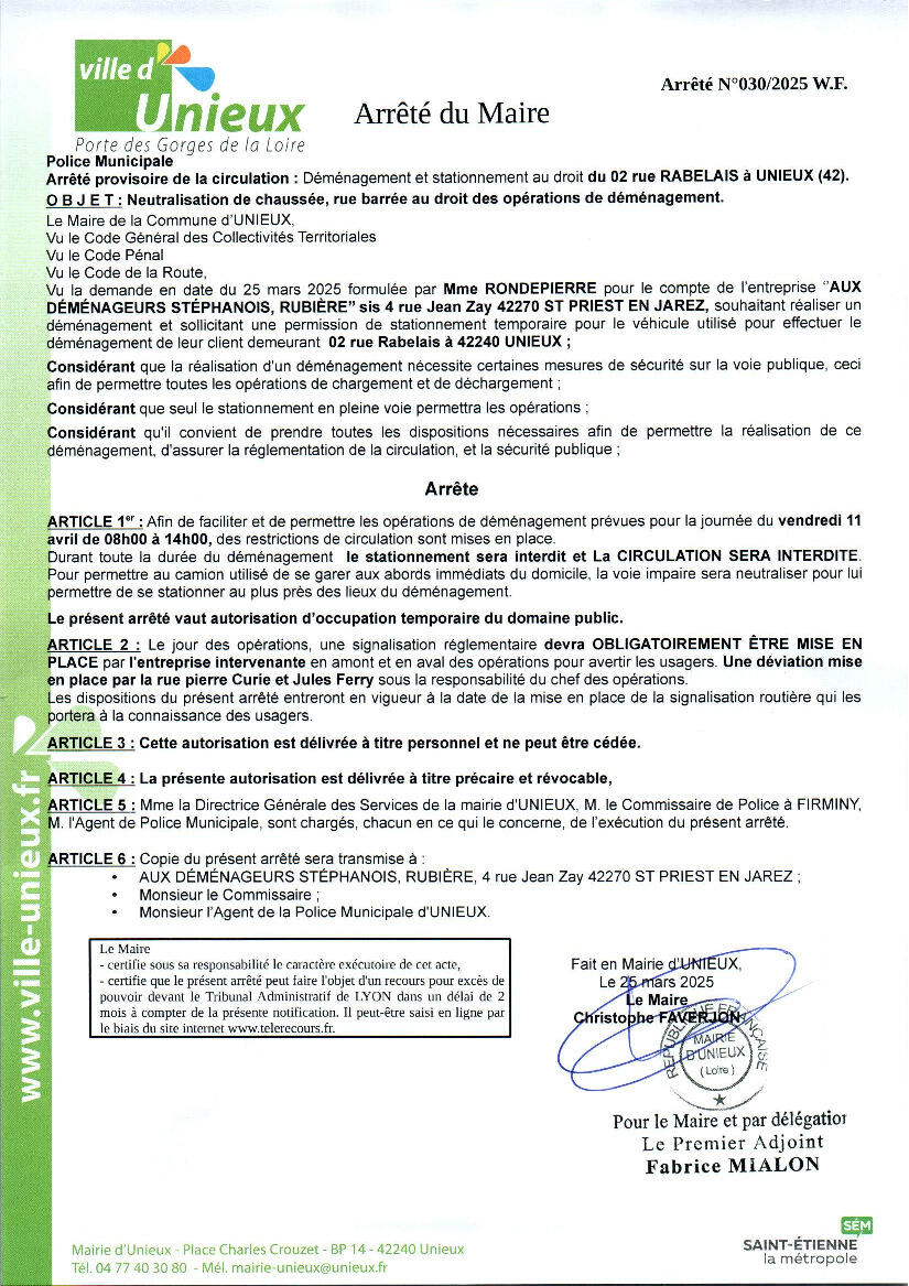 En raison d'un déménagement au 2 rue Rabelais à Unieux, des restrictions de circulation et de stationnement seront mises en place le vendredi 11 avril 2025 de 8h00 à 14h00.