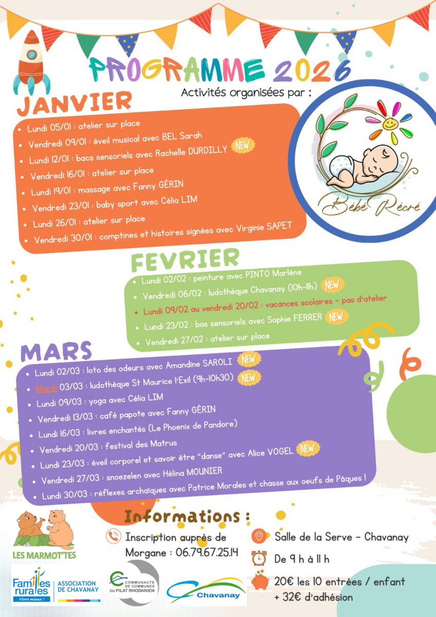 Dans le cadre des actions menées par l’Association Familles Rurales de Chavanay, sont organisés, au premier trimestre 2026, les ateliers Bébé Récré, destinés aux parents et à leurs enfants de moins de 3 ans. (ouvert à tous).