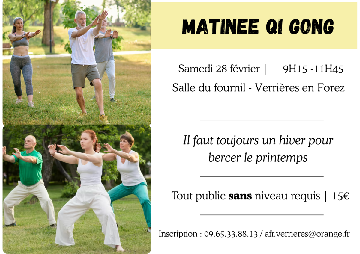 Matinée de Qi Gong saisonnier 2/24/26 Il reste encore des places pour la matinée de Qi Gong de samedi ! Inscription : afr.verrieres@orange.fr ou au 09 65 33 88 13