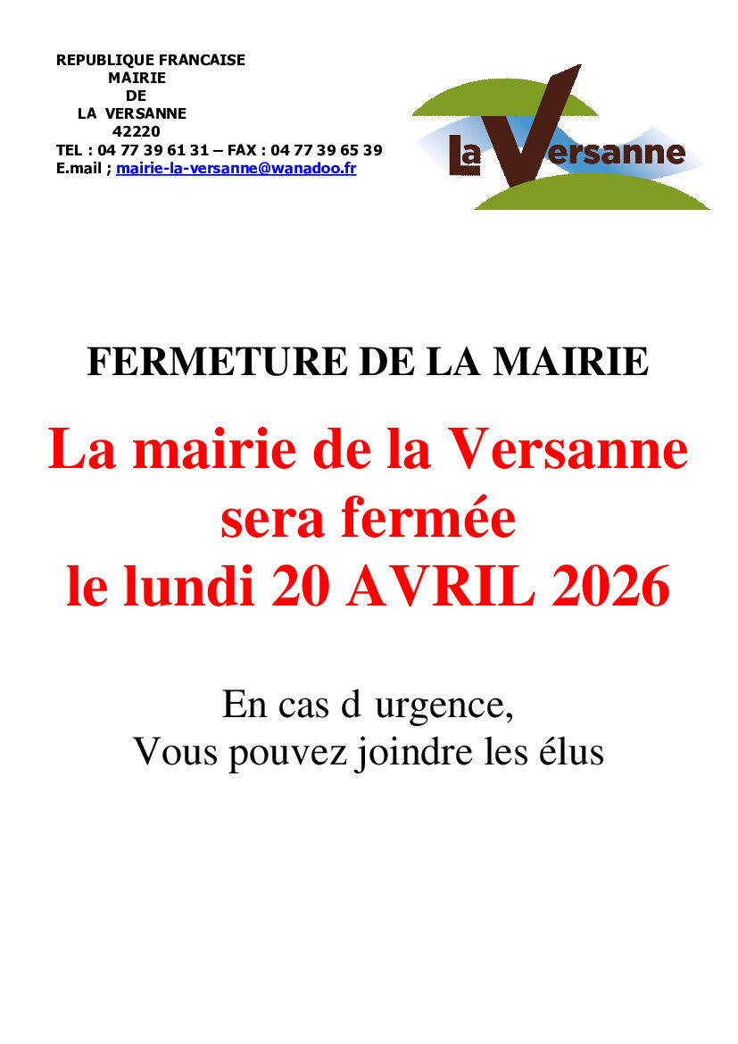 FERMETURE DE LA MAIRIE LUNDI 20 AVRIL 2026 4/14/26 La mairie de la Versanne sera fermée le lundi 20 avril 2026