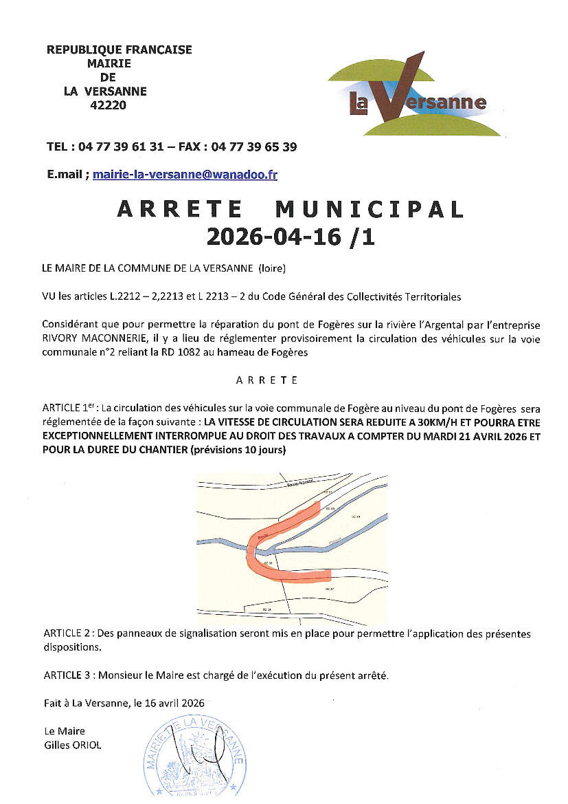 L'entreprise RIVORY MACONNERIE va intervenir à partir du mardi 21 avril 2026 pour la réparation du pont de Fogères endommagé par les inondations de 2024.
