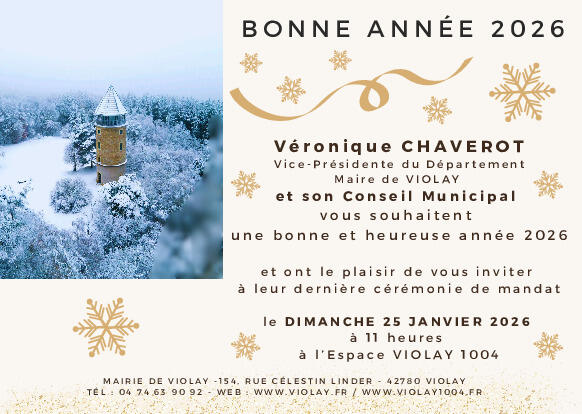 Je vous rappelle la cérémonie des vœux ce dimanche 25 janvier à 11 HEURES à l'espace Violay 1004 et je vous espère nombreux (inutile de vous inscrire en Mairie).