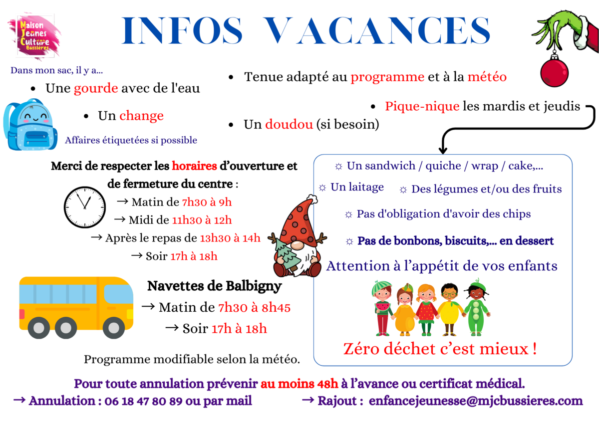 En pièce jointe le programme du centre de loisirs pour les vacances de Noël. Nous serons ouvert les deux lundis et mardis des vacances.