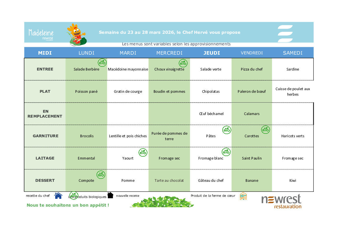 Menu du 23 mars au 28 mars 2026