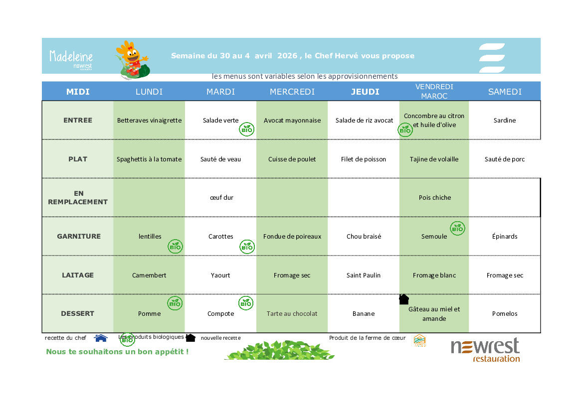 Menus du 30 mars au 4 avril 2026