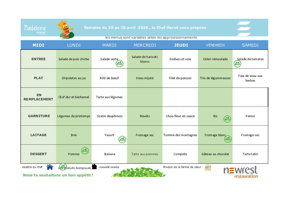 Menus du 20 au 26 avril 2026