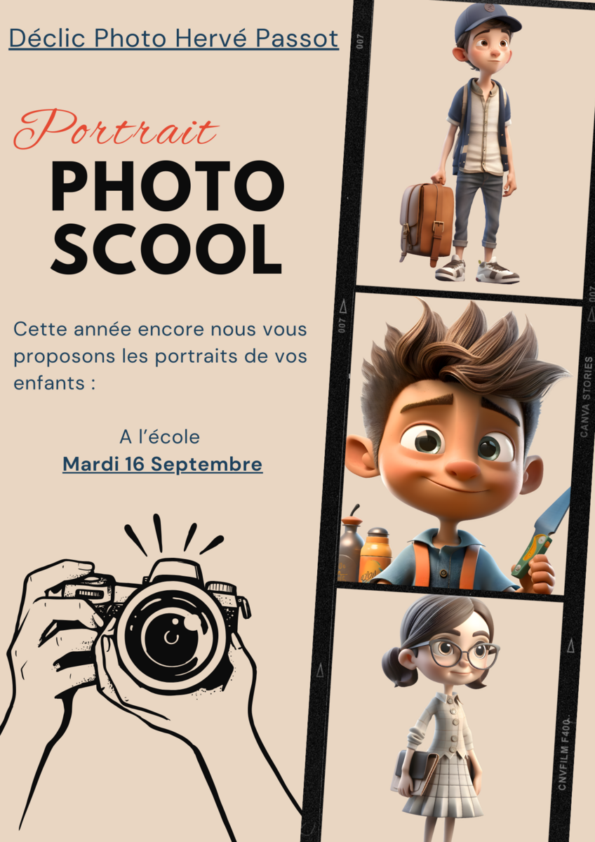 Nous confirmons que la sĂ©ance photo (portraits individuels & fratries) aura lieu le MARDI 16 septembre Ă  l’école, avec le photographe HervĂ© PASSOT.