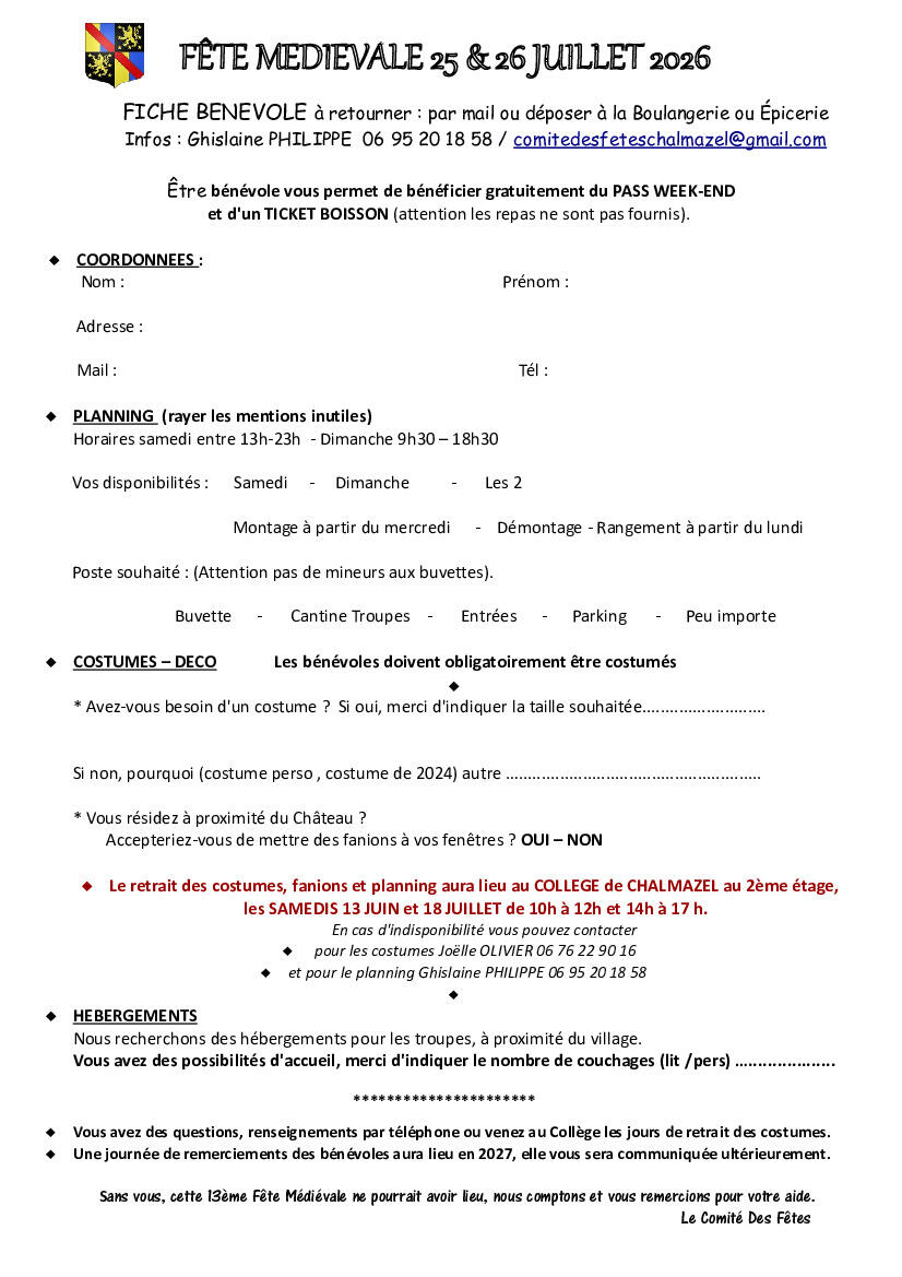 Pour toute information, contactez Ghislaine PHILIPPE au 06 95 20 18 58 ou par mail : comitedesfeteschalmazel@gmail.com