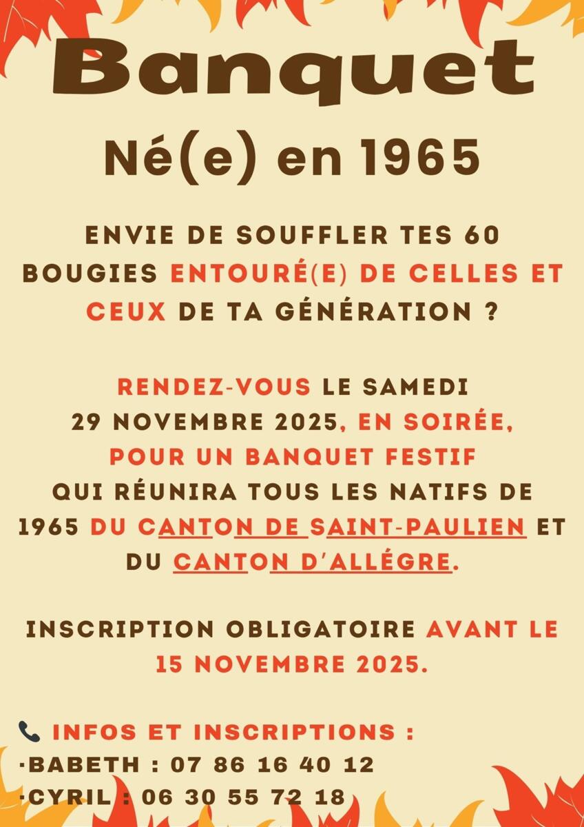 📅 Rendez-vous le samedi 29 novembre 2025, en soirée, pour un banquet festif qui réunira tous les natifs de 1965 des cantons de Saint-Paulien et d'Allègre.