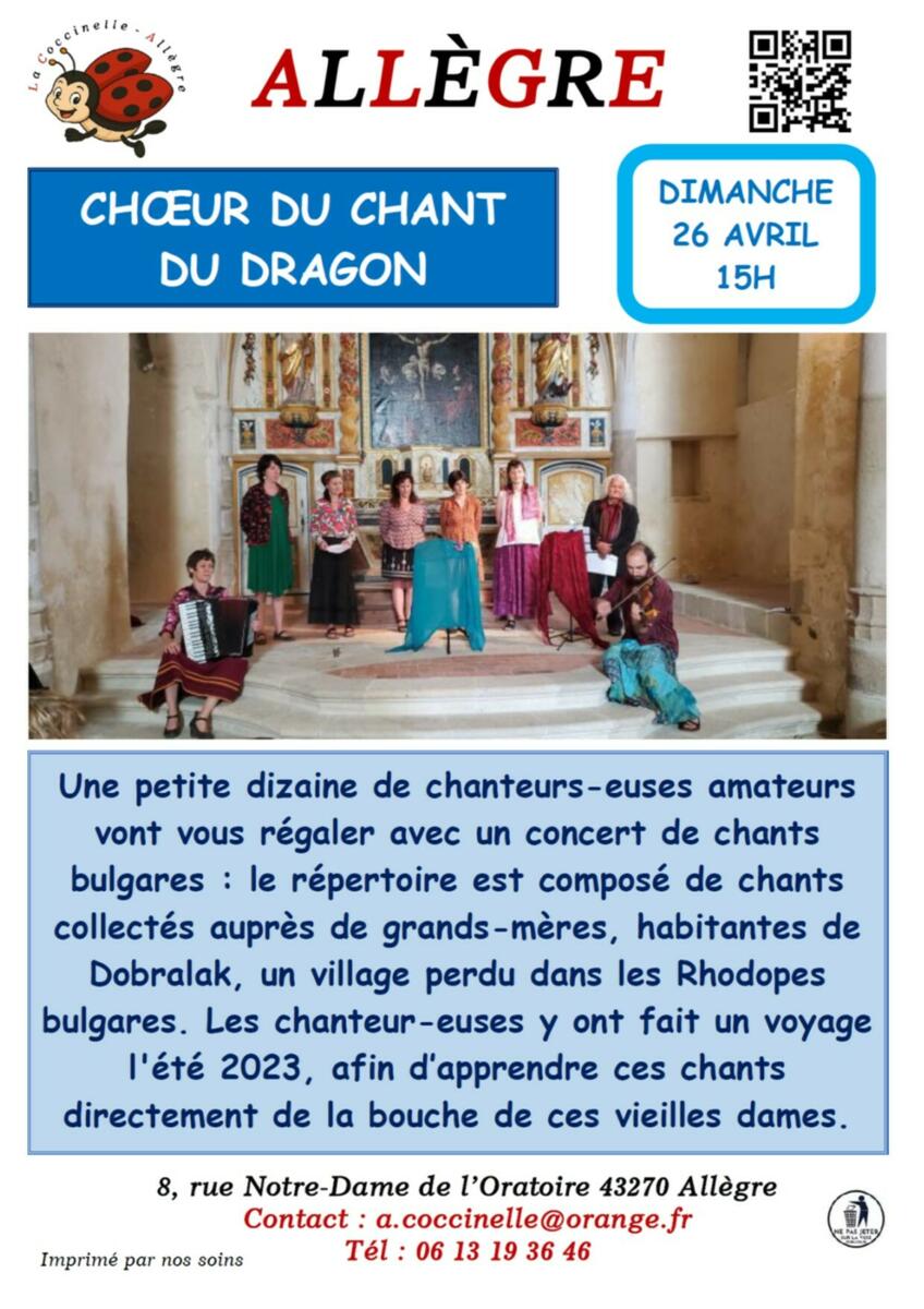 - Concert Choeur du chant du dragon dimanche 26 avril à 15h00.