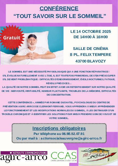 En partenariat avec AGIRC-ARRCO, le C.C.A.S. de Blavozy organise une conférence sur la thématique du sommeil qui aura lieu le mardi 14 octobre 2025 de 14h00 à 16h00 à la salle de cinéma.
