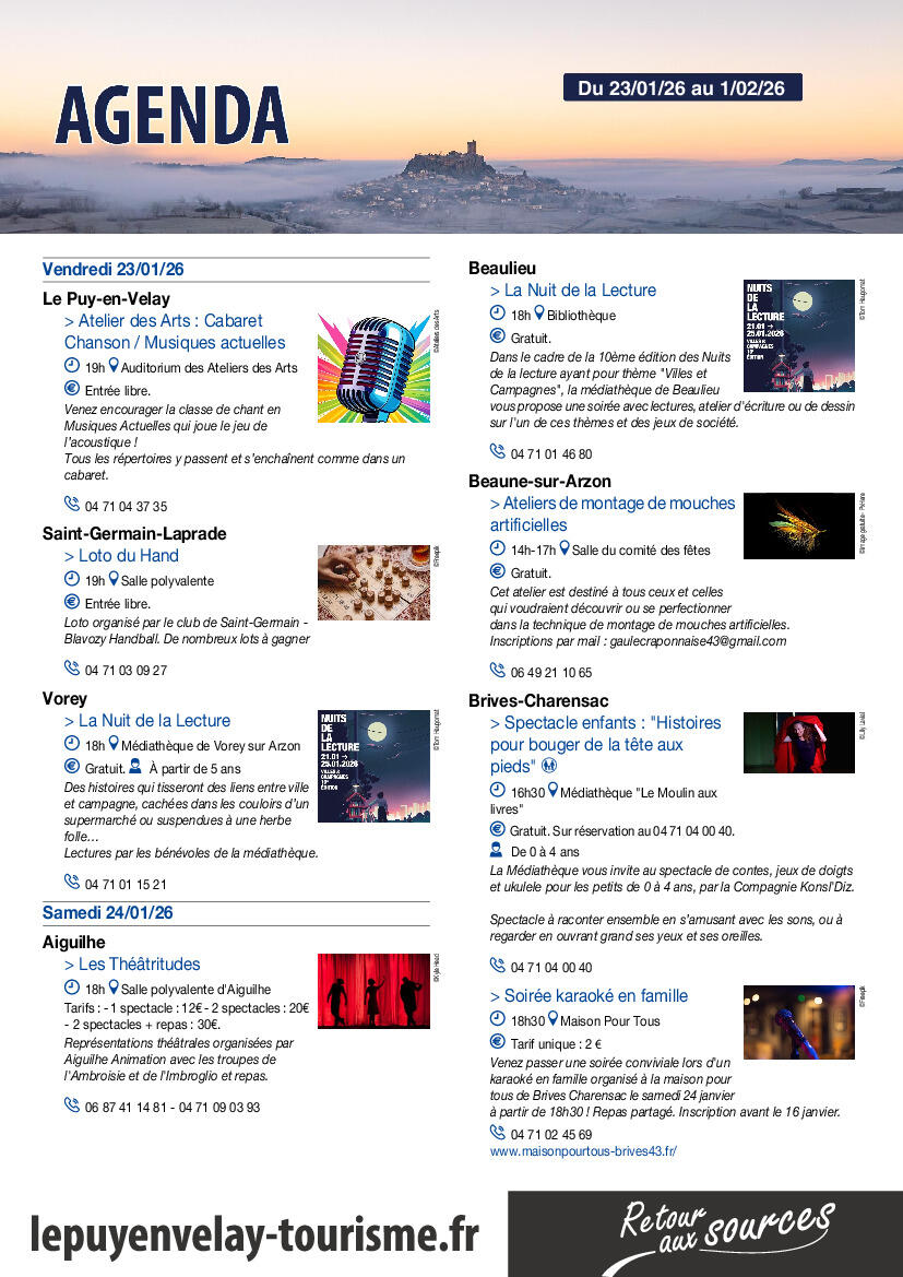 Veuillez trouver ci-joint l'agenda des animations du 23/01 au 01/02/2026 sur toute l'Agglomération du Puy-en-Velay.