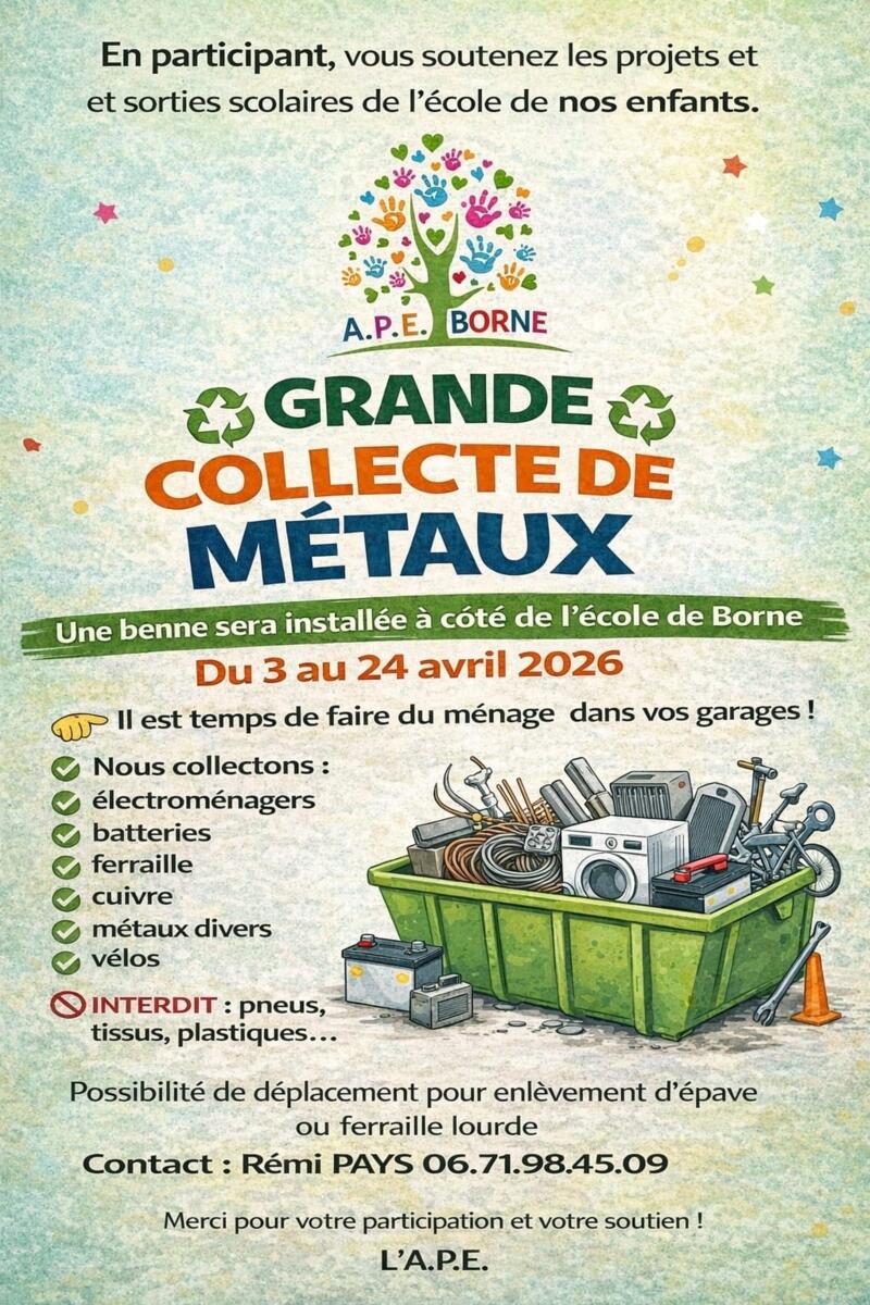 L'Association des Parents d’Élèves de l’École Félix Pouille de Borne organise une grande collecte de métaux du 3 au 24 avril 2026.