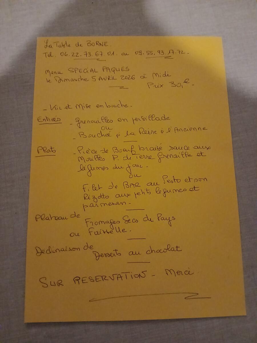 La Table de Borne (16 Route Nationale 102) aura le plaisir de vous accueillir le dimanche 5 avril 2026 avec son menu spécial "Pâques"