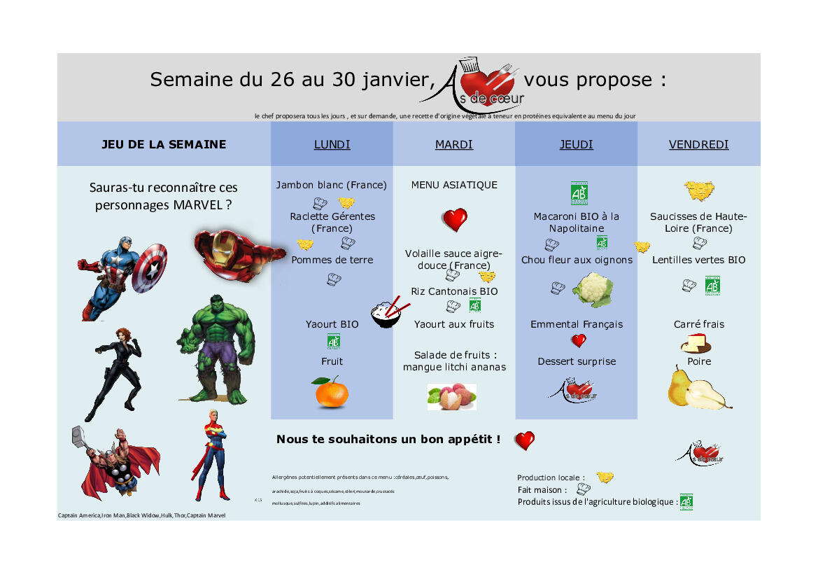 Menu cantine 26 au 30 janvier 2026 1/18/26 Vous trouverez ci-joint le menu de la semaine du 26 au 30 janvier 2026. Source : Mairie de Borne