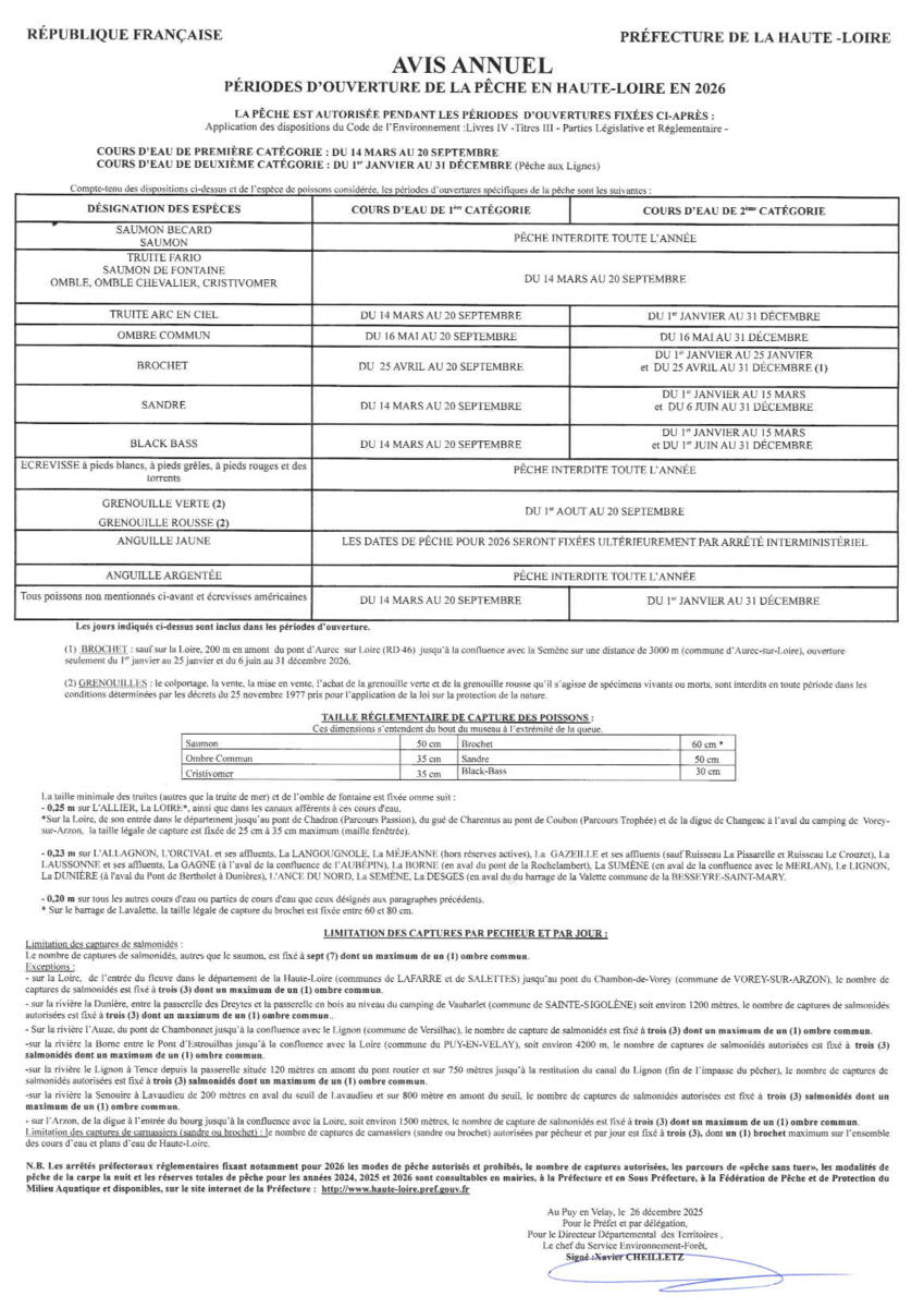 Veuillez trouver ci-joint l'arrêté DDT-SEF n°2025-561 portant réglementation de l’exercice de la pêche en eau douce dans le département de la Haute-Loire en 2026 ainsi que l'avis pêche 2026.