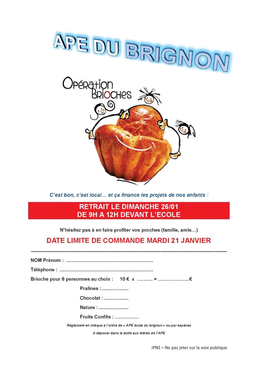 L'APE de l'école du Brignon organise sa traditionnelle vente de brioches le dimanche 26 janvier de 9h à 12h devant l'école.