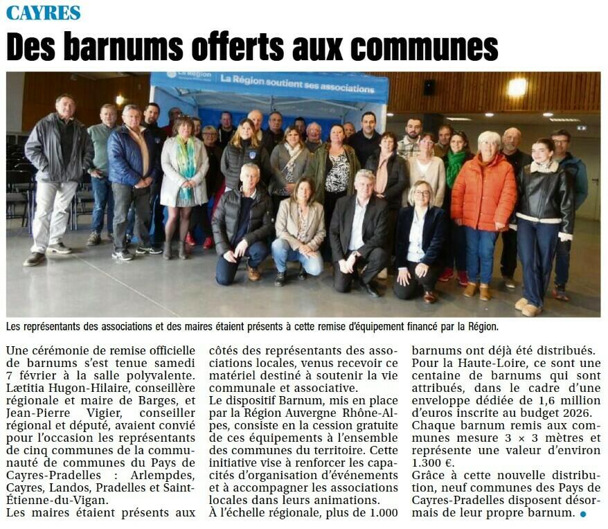 Samedi 7 février, Cayres accueillait ses représentants de la Région Auvergne-Rhône-Alpes pour la remise de barnums aux communes d' Arlempdes, de Cayres, de Landos, de Pradelles et de Saint Étienne du Vigan.