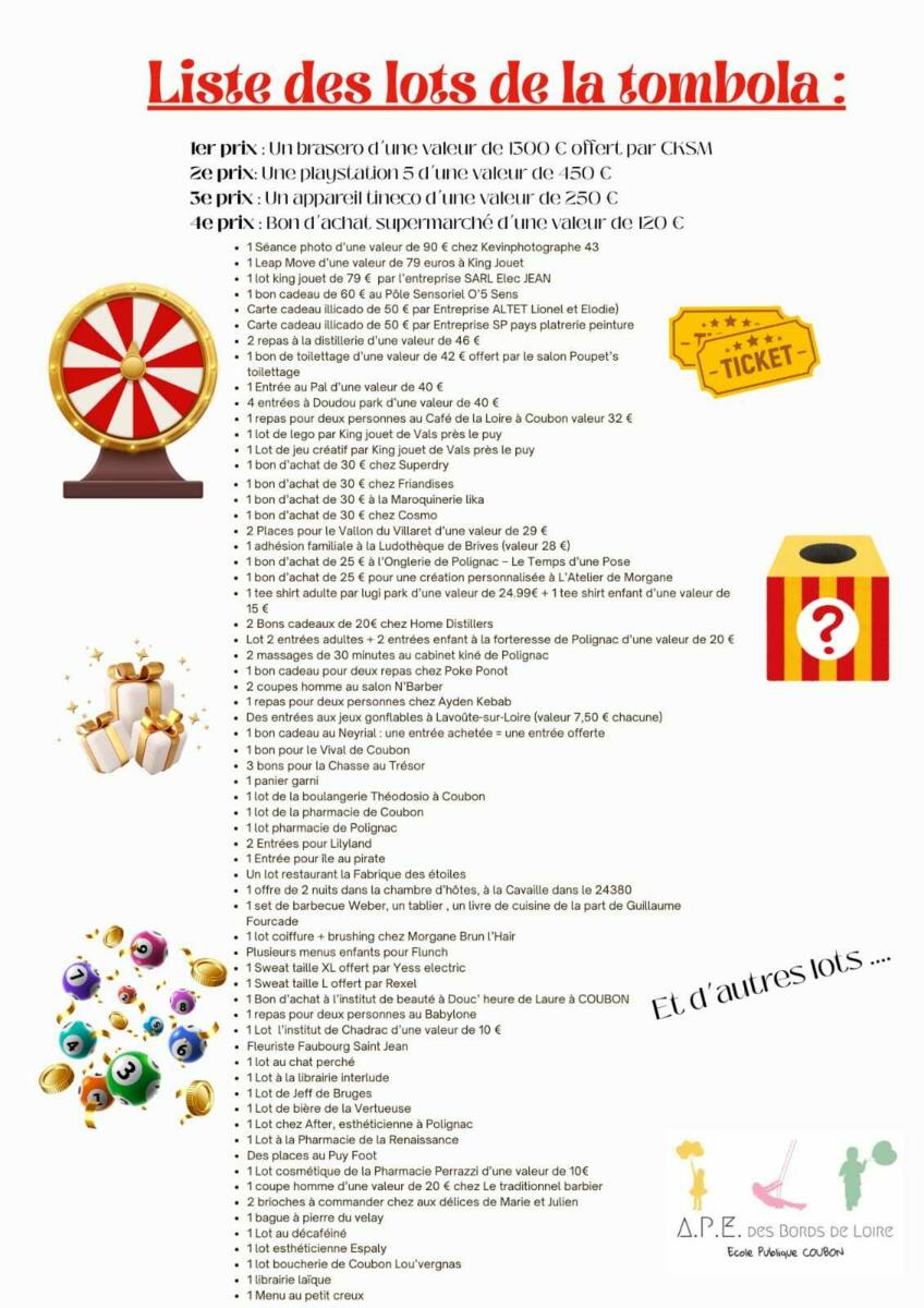 L’APE des Bords de Loire organise une grande tombola dont le tirage au sort aura lieu le dimanche 14 décembre lors du marché de Noël de Coubon.