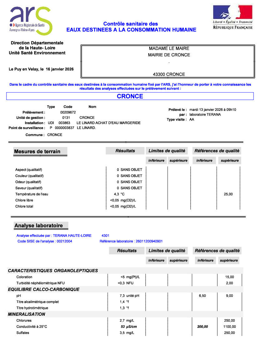 Résultats Analyses eau CRONCE LESTIGEOLLET LINARD