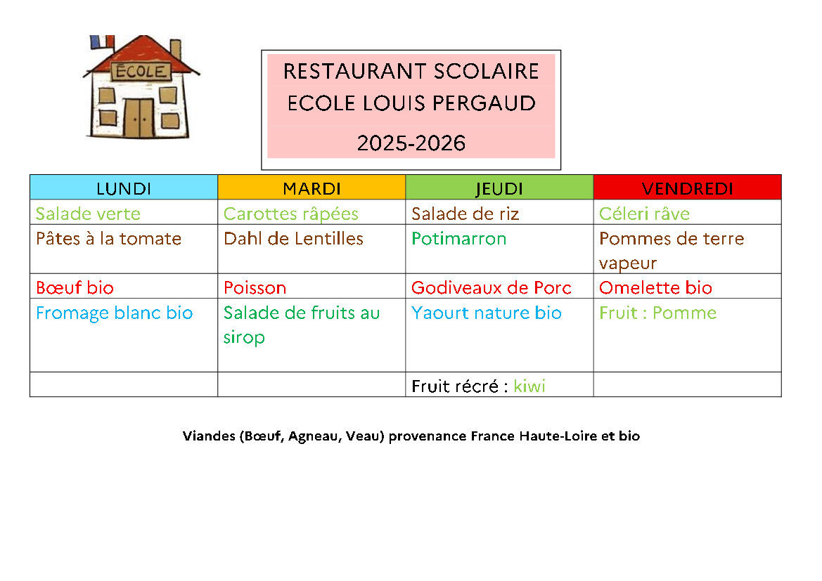 🍽 Menu du restaurant scolaire 1/8/26 Menu du 12 au 16 janvier 2026 Source : Mairie de Cussac-sur-Loire