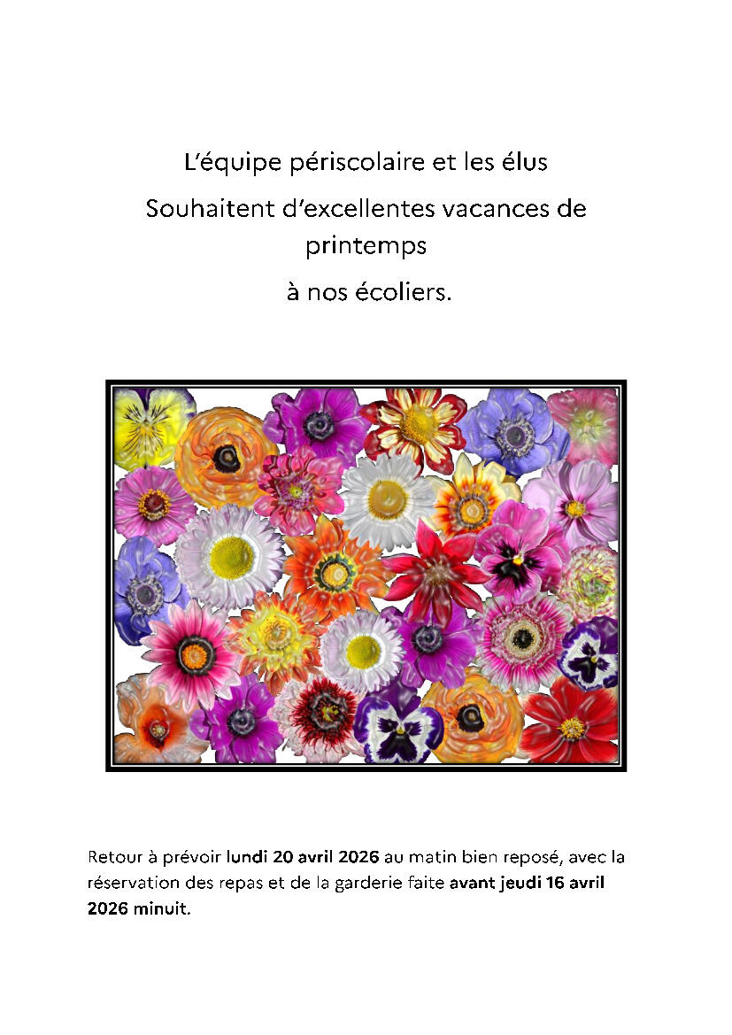 Vacances scolaires du 3 avril au soir jusqu'au 19 avril 2026 4/2/26 Bonnes vacances de printemps à nos écoliers