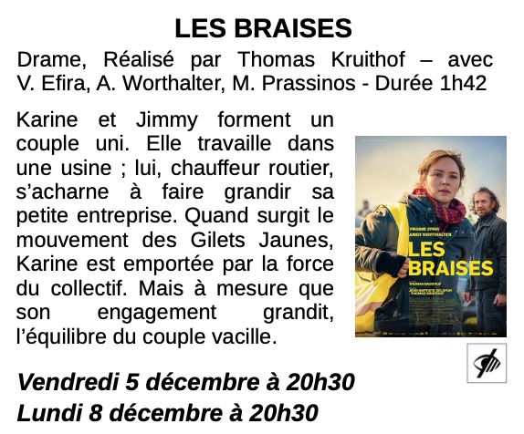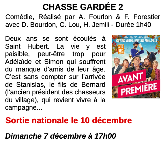 Au cinéma de Dunières ce week-end : 12/3/25 LES BRAISES Drame. LA BONNE ÉTOILE Comédie CHASSE GARDÉE 2 Comédie.