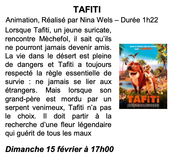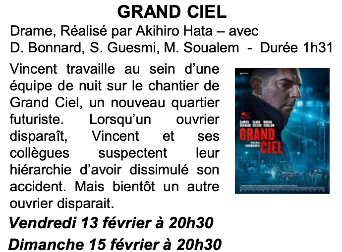 Au cinéma de Dunières ce week-end : 2/11/26 GRAND CIEL Drame. LE MAGE DU KREMLIN Thriller . TAFITI Animation.