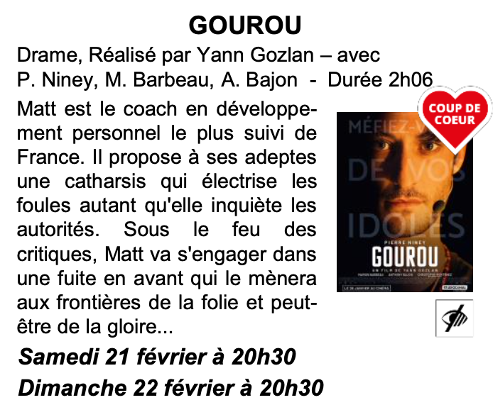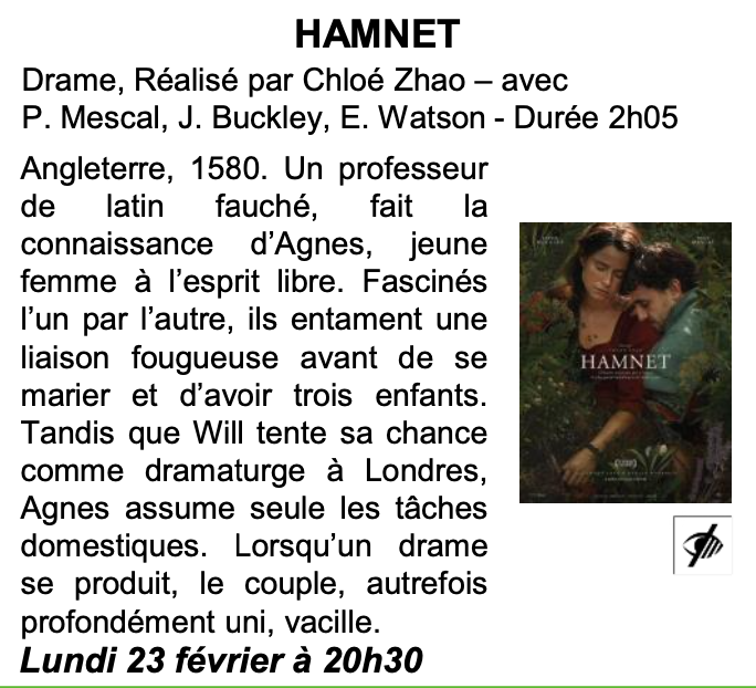 Au cinéma de Dunières ce week-end : 2/19/26 EN ROUTE ! Animation. LES LÉGENDAIRES Animation. GOUROU Drame. HAMNET Drame.