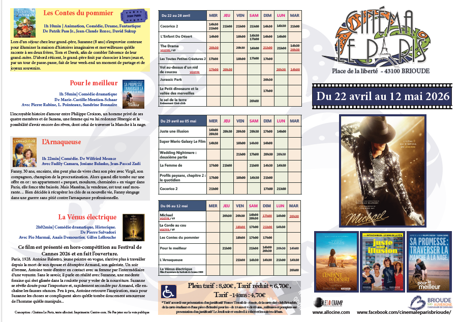 Le programme du Cinéma Le Paris pour la période du 22 avril au 12 mai 2026.