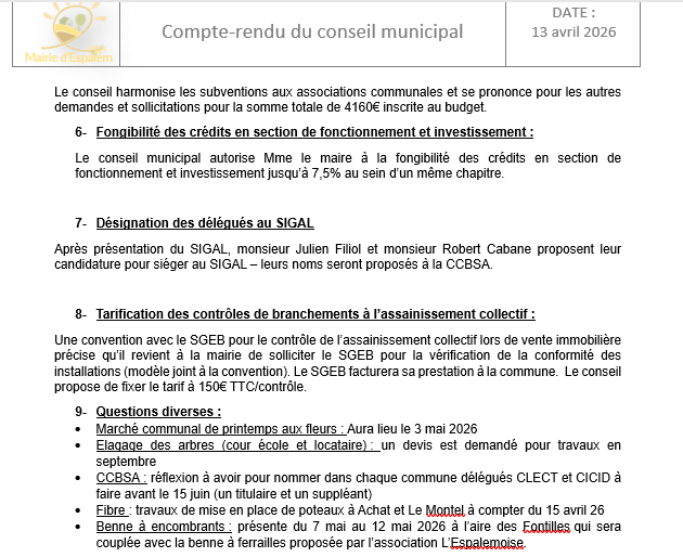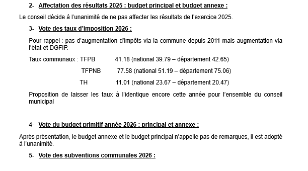 Compte-rendu du conseil municipal du 13 avril 4/20/26 Compte-rendu du CM du 13 avril 2026 avec vote CFU et Budget prévisionnel