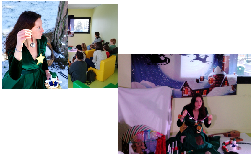 ❄ Dans un dĂ©cor enneigĂ©, la magie de noĂ«l Ă©tait prĂ©sente le 3 dĂ©embre Ă  la MĂ©diathĂšque Espaly Saint-Marcel. La conteuse Marina a rĂ©ussi par ses chants, son dĂ©cor et ses projections Ă  nous embarquer petits et grands dans les aventures de Jack au PĂŽle Nord. RevĂȘtue d’un grande robe longue vert sapin, la conteuse laisse transparaitre au fur Ă  mesure des accessoires, des figurines et des instruments de musique