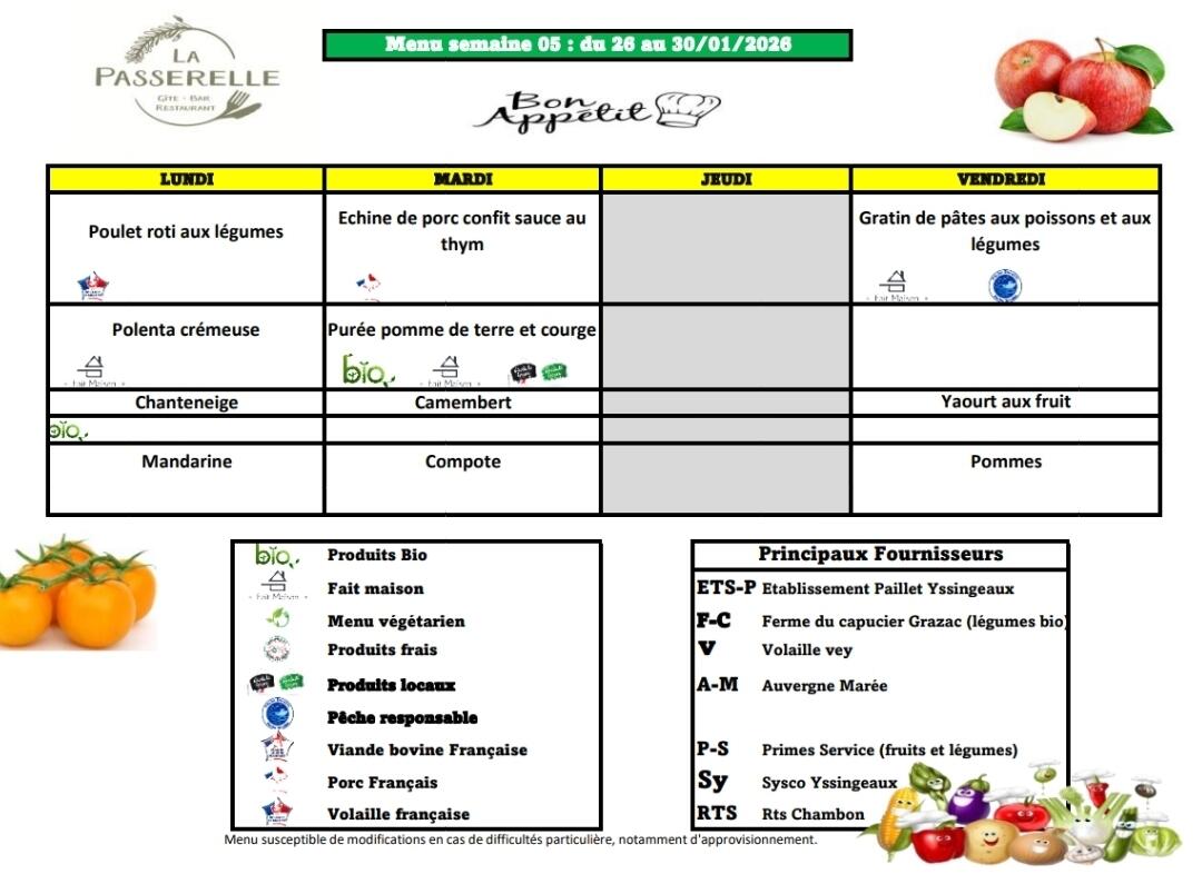 Cantine Scolaire: Menu . 1/22/26 Voici le menu de la Cantine de la Semaine 05 de notre école St Joseph. Bon appétit ! Source : Mairie de Grazac