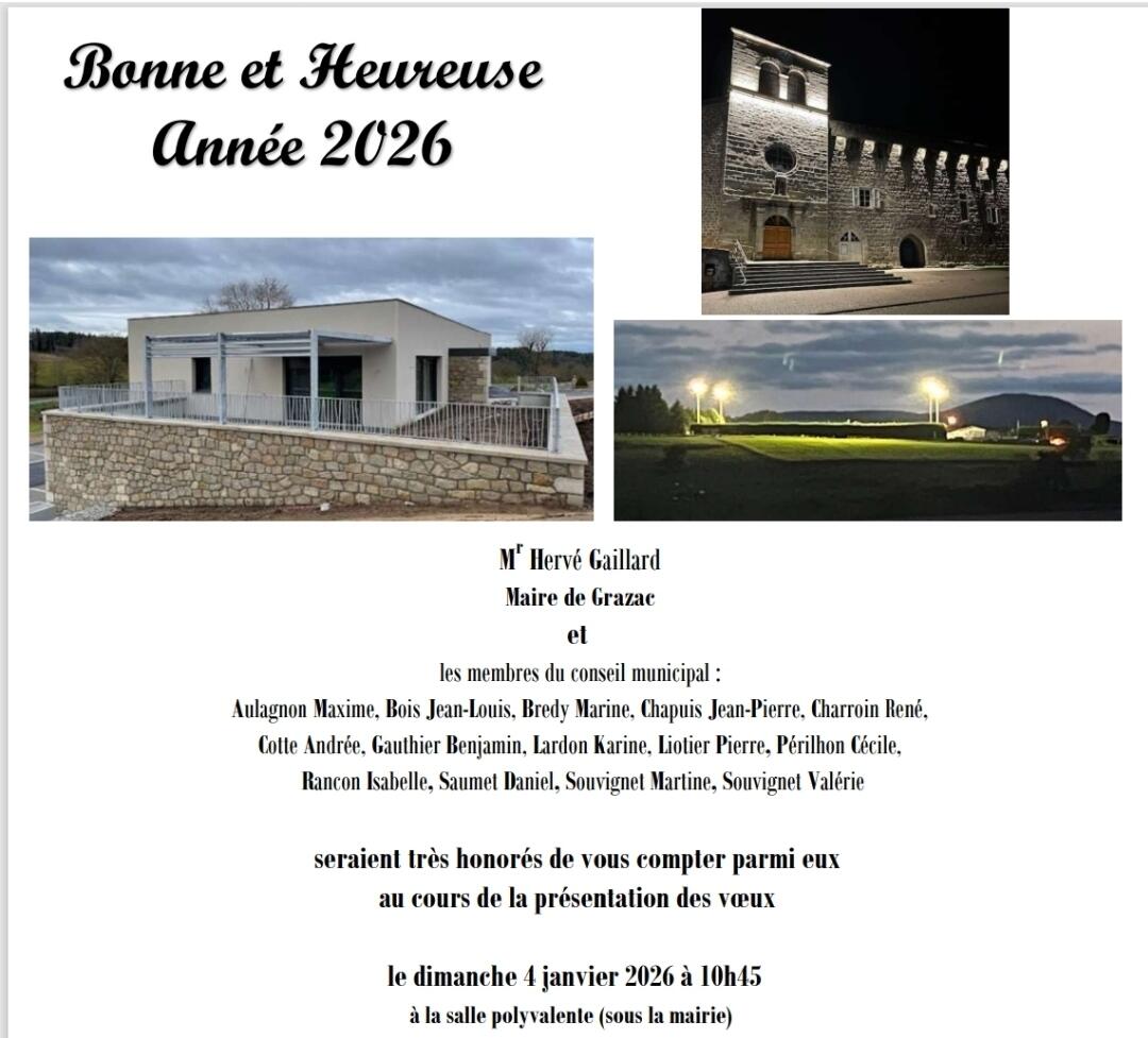 Mr le Maire ainsi que toute l'équipe municipale vous souhaite une bonne année 2026 ainsi qu'une bonne santé à vous et vos familles ! A dimanche 04 Janvier 2026 pour la traditionnelle cérémonie des voeux du Maire 🎊🎉🥂