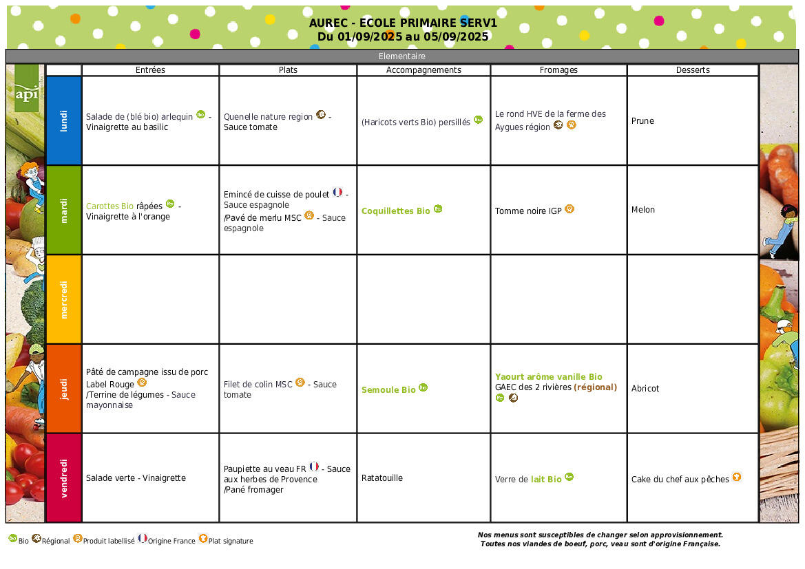 Menus du 01 septembre 2025 au 05 septembre 2025
