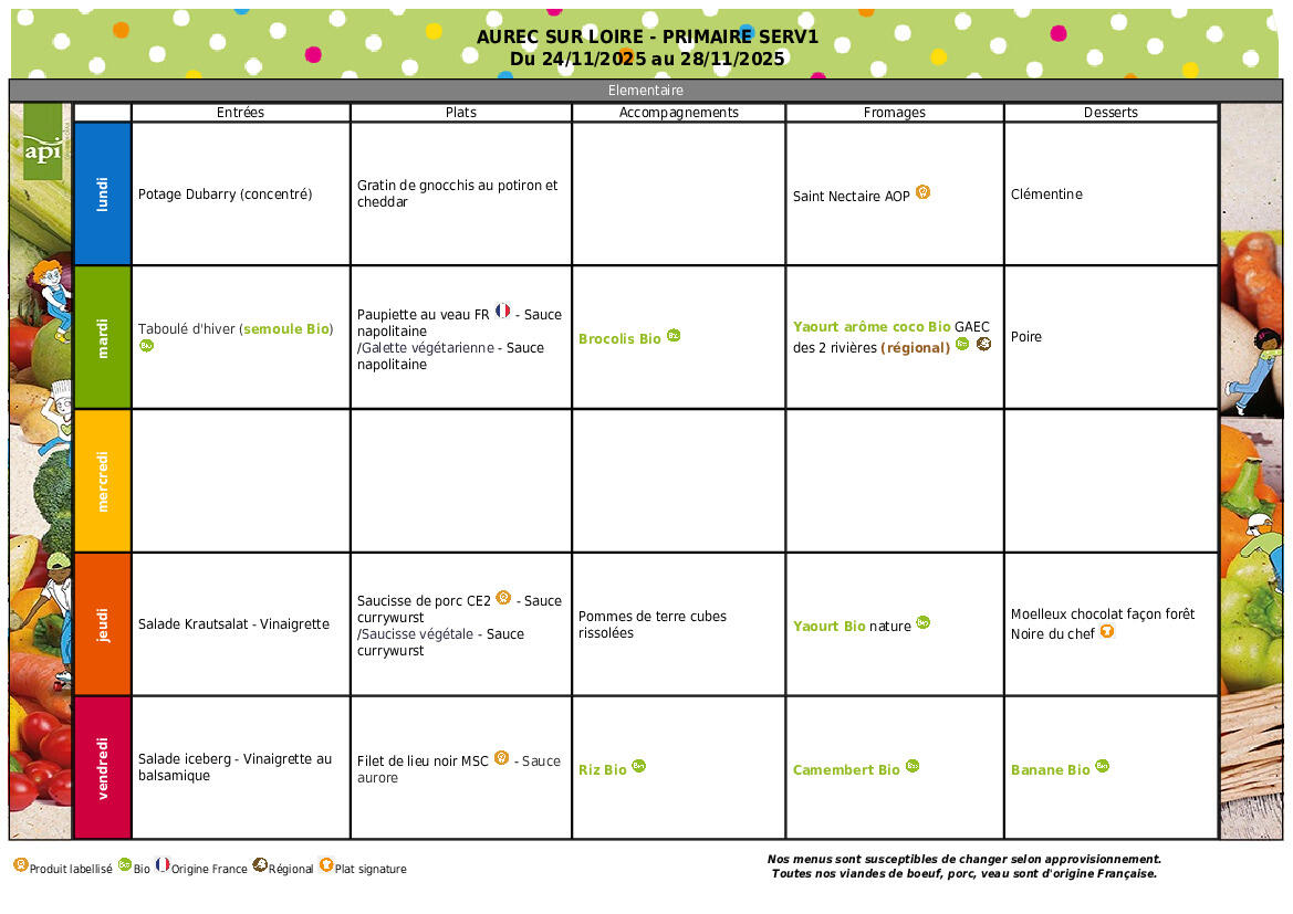 Menus du 24 novembre 2025 au 28 novembre 2025