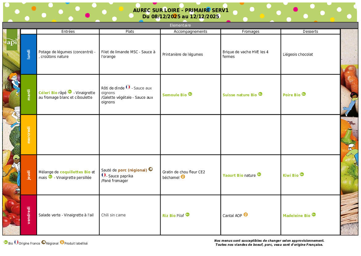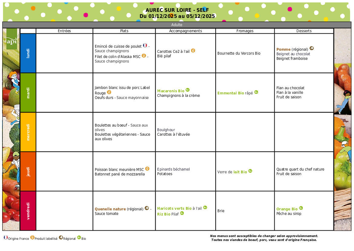 Menus du 1er décembre 2025 au 05 décembre 2025