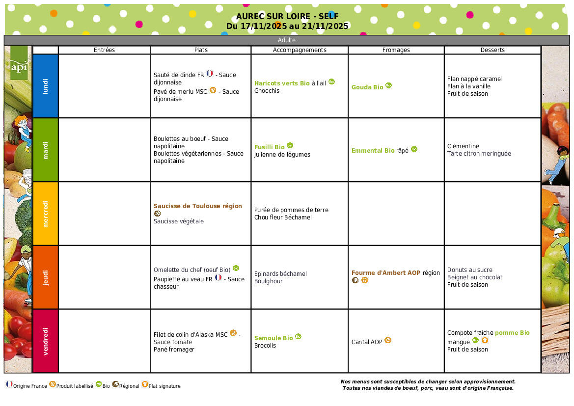 Menus du 17 novembre 2025 au 21 novembre 2025