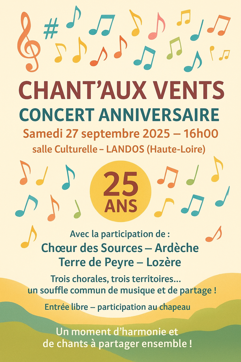 Cette année, la chorale CHANT’AUX VENTS souffle ses 25 bougies et vous convie à un après-midi exceptionnel sous le signe du chant, de la musique, de la rencontre et de l’émotion partagée. 🎵🎶🎼