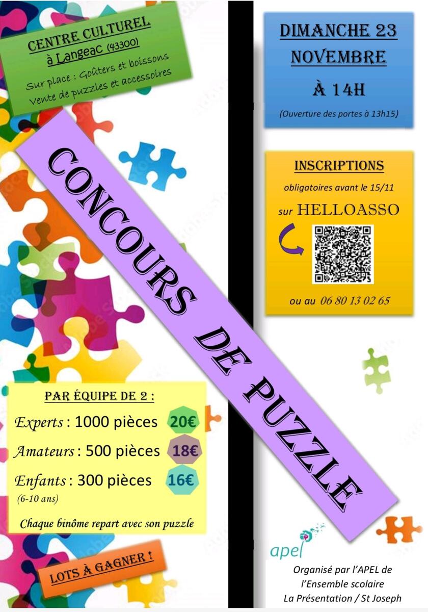 L'APEL de l'Ensemble scolaire La Présentation-Saint Joseph organise un concours de puzzle, dimanche 23 novembre, à 14h, au centre culturel.