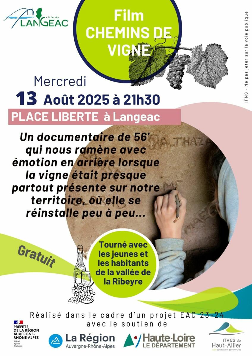 Le documentaire "Chemins de vigne" réalisé et tourné dans la vallée de La Ribeyre, sera projeté, mercredi 13 août à 21h30, place de la liberté. Gratuite et ouvert à tous.