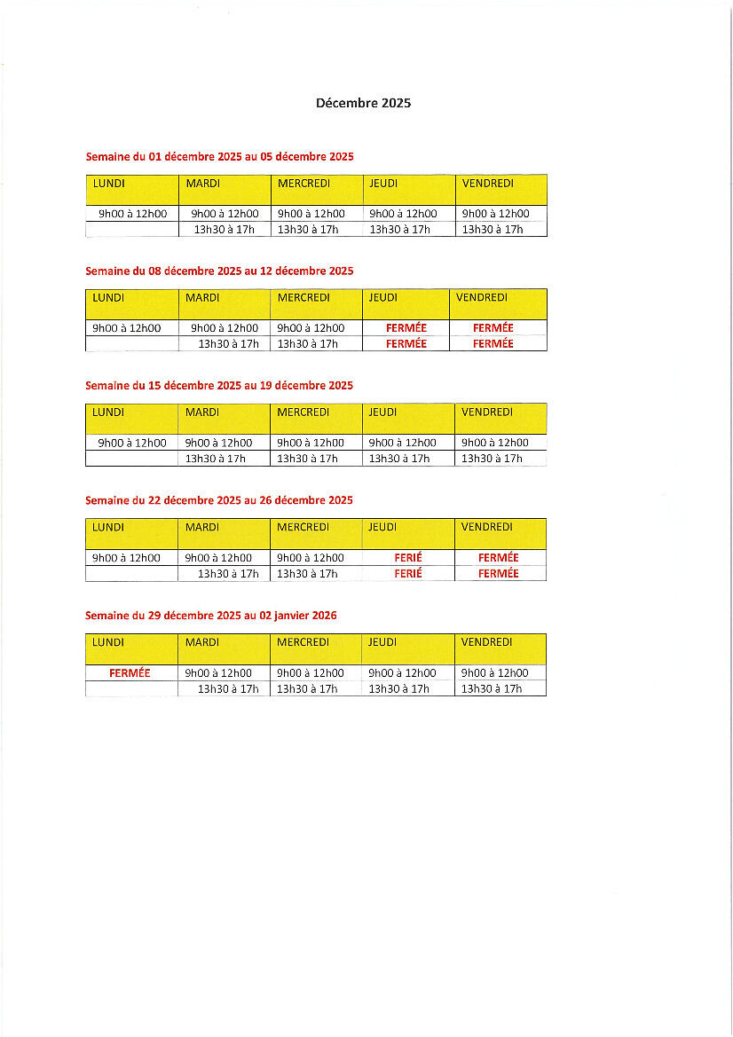 HORAIRES MAIRIE DÉCEMBRE 2025