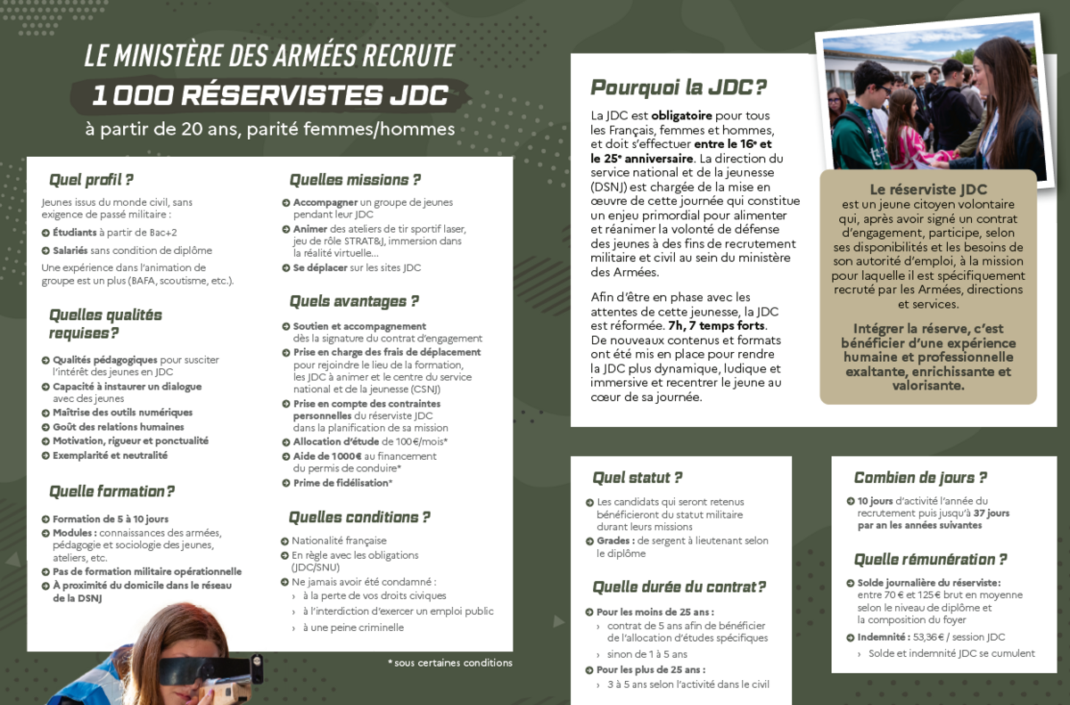 Le Centre du Service national et de la jeunesse de Clermont-Ferrand poursuit son recrutement de réservistes afin de renforcer ses équipes d’animateurs-accompagnateurs lors des Journées Défense et Citoyenneté.
