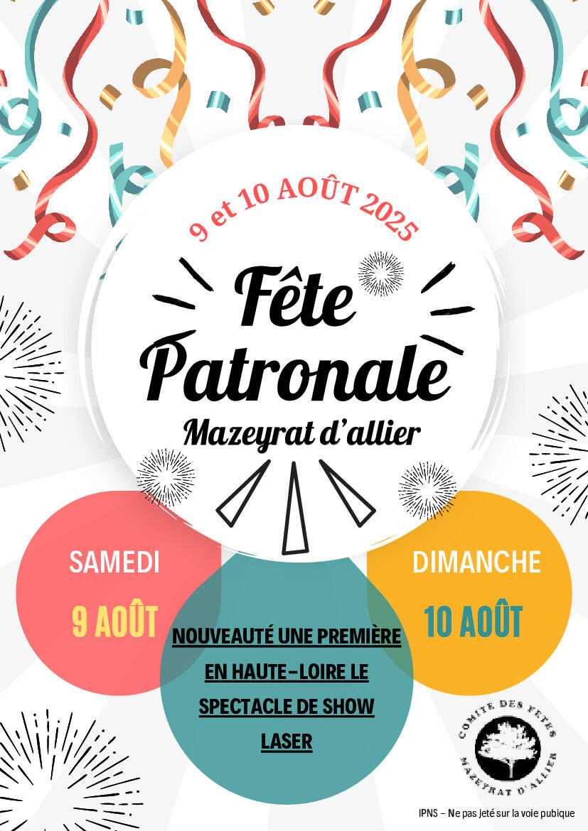 La Fête Patronale de Mazeyrat d'Allier est organisée les samedi 9 et dimanche 10 août 2025 à Mazeyrat d'Allier.