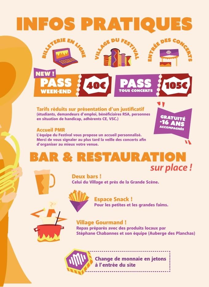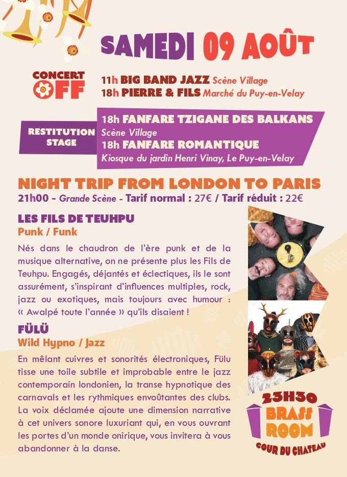 Sans oublier, tous les jours 脿 11h et 18h, les nombreux concerts OFF au village du Festival (Place du Vallat) avec New Orleans Syndicate, Touzdec, Tzila Brass, Picardy Stompers, Pierre & Fils, Big Band Jazz et bien s没r la Fanfare Tzigane des Balkans (restitution stage) !